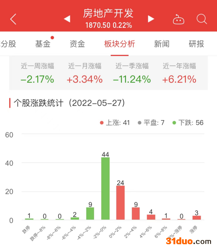 中国经济网北京5月27日讯 今日,房地产开发板块整体涨幅0.22%,其中41只股票上涨,7只股票平盘,56只股票下跌。