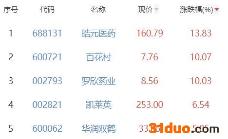 其中,皓元医药、百花村、罗欣药业、凯莱英、华润双鹤位列板块涨幅前五位,涨幅分别为13.83%、10.07%、10.03%、6.54%、5.85%。
