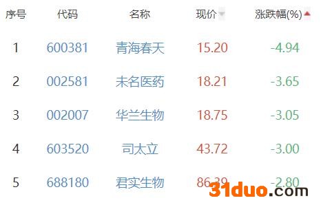 青海春天、未名医药、华兰生物、司太立、君实生物位列涨幅榜后五位,涨幅分别为-4.94%、-3.65%、-3.05%、-3.00%、-2.80%。