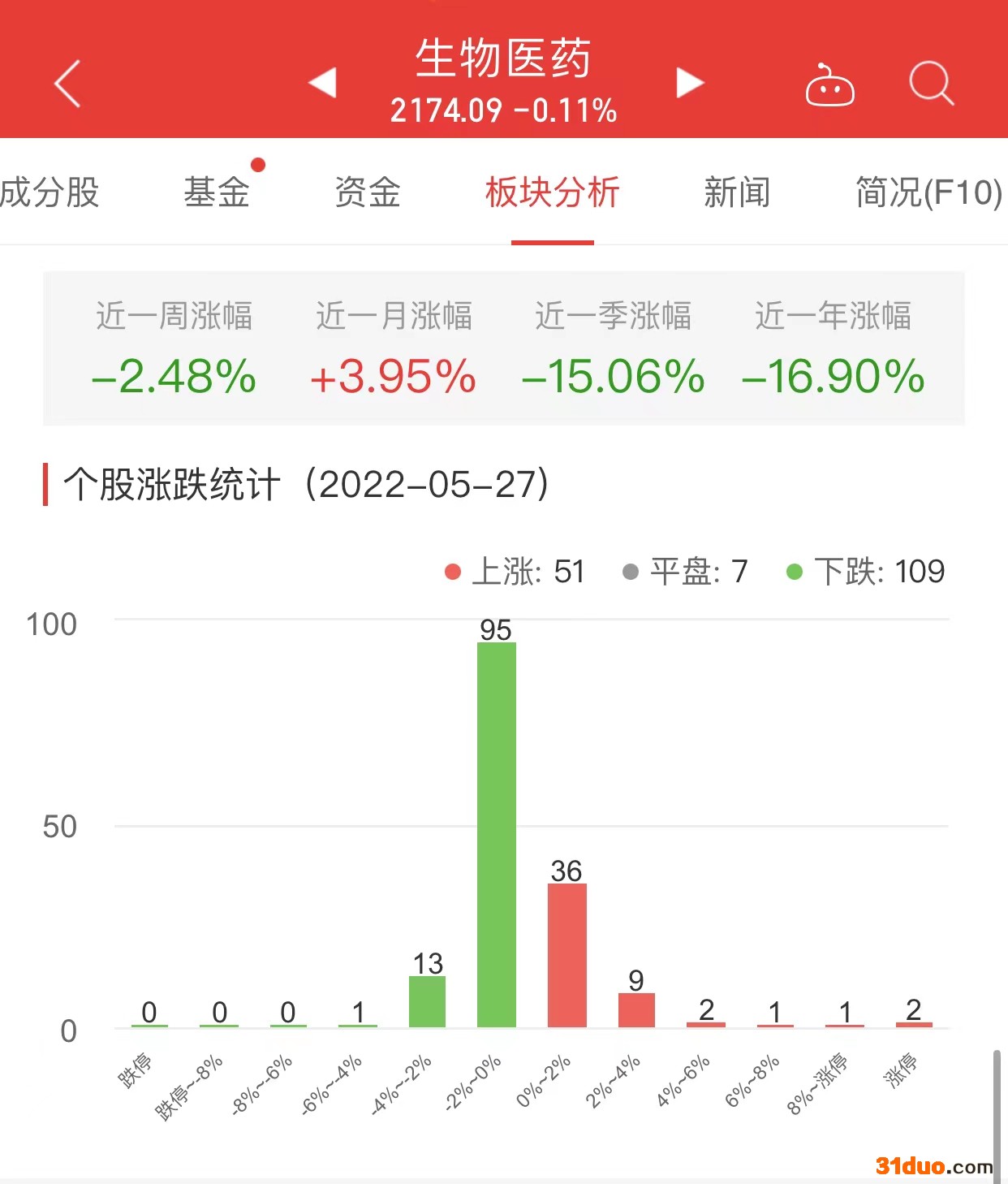 中国经济网北京5月27日讯 今日,生物医药板块整体跌幅0.11%,其中51只股票上涨,7只股票平盘,109只股票下跌。