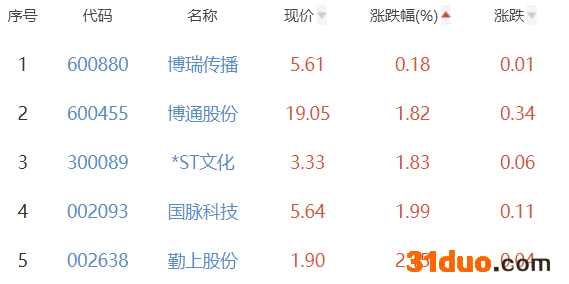 博瑞传播、博通股份、*ST文化、国脉科技、勤上股份位列涨幅榜后五位,涨幅分别为0.18%、1.82%、1.83%、1.99%、2.15%。