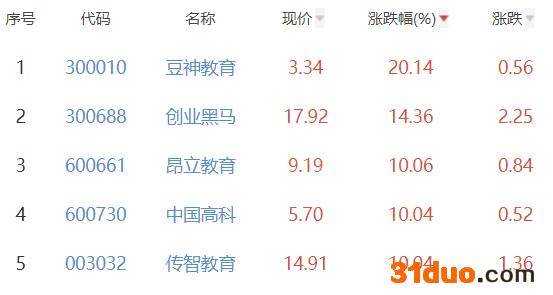 其中,豆神教育、创业黑马、昂立教育、中国高科、传智教育位列板块涨幅前五位,涨幅分别为20.14%、14.36%、10.06%、10.04%、10.04%。