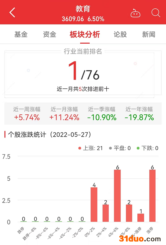 中国经济网北京5月27日讯 今日,教育板块整体涨幅6.50%,其中,21只股票上涨。