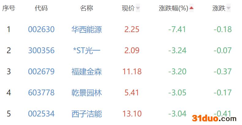 华西能源、*ST光一、福建金森、乾景园林、西子洁能位列涨幅榜后五位,涨幅分别为-7.41%、-3.24%、-3.20%、-3.05%、-3.04%。