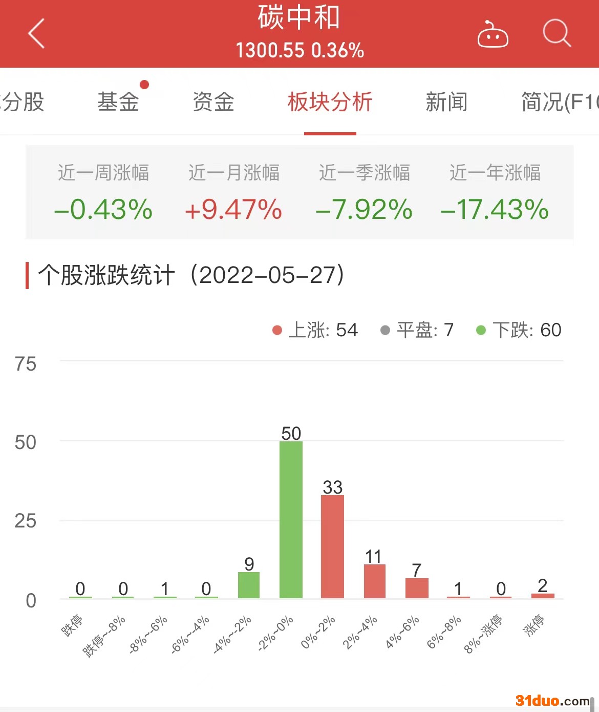 中国经济网北京5月27日讯 今日,碳中和板块整体涨幅0.36%,其中54只股票上涨,7只股票平盘,60只股票下跌。