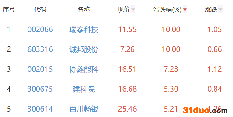 其中,瑞泰科技、诚邦股份、协鑫能科、建科院、百川畅银位列板块涨幅前五位,涨幅分别为10.00%、10.00%、7.28%、5.30%、5.21%。