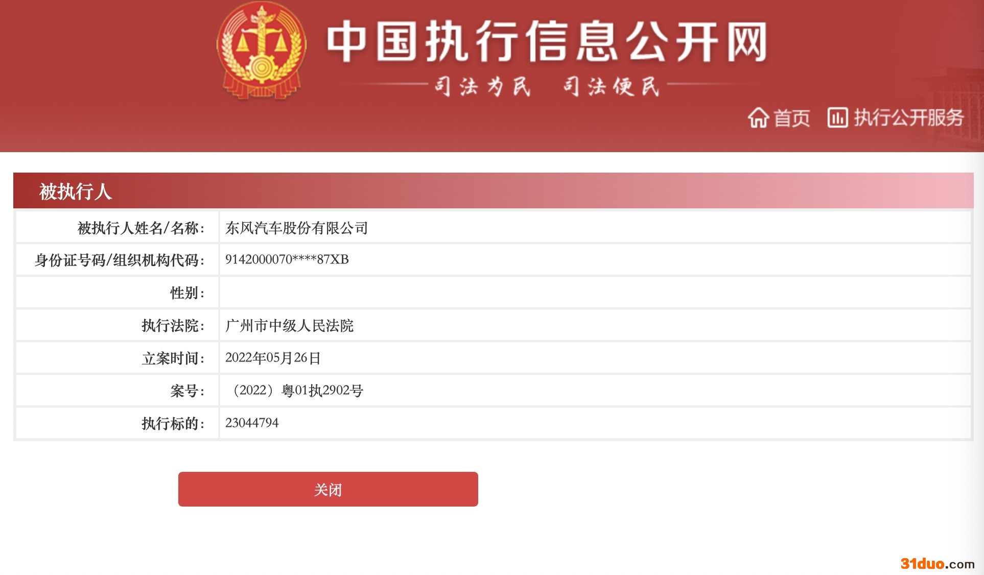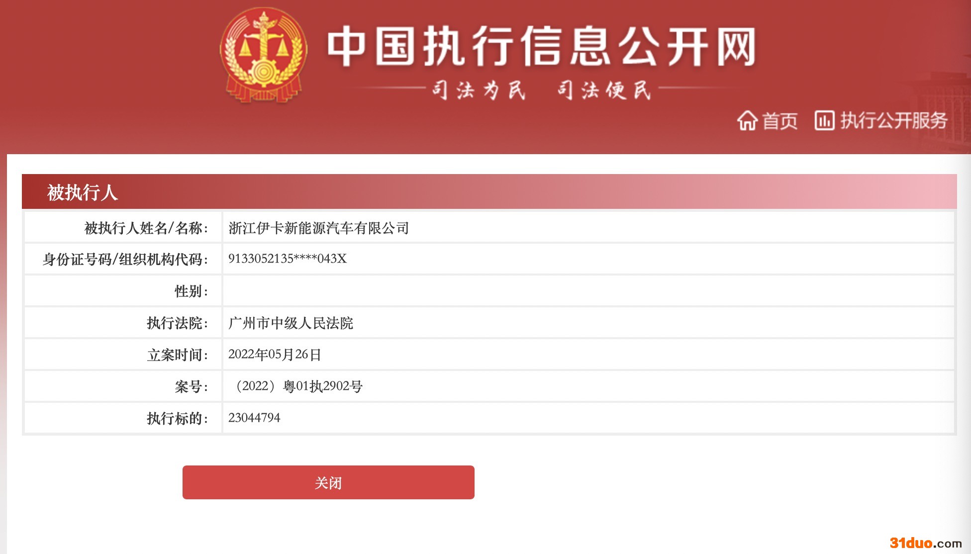 来源:中国执行信息公开网截图公开信息显示,2022年5月26日,东风汽车股份有限公司、浙江伊卡新能源汽车有限公司和浙江时空能源技术有限公司被广州市中级人民法院强制执行23044794元,案号为(2022)粤01执2902号。