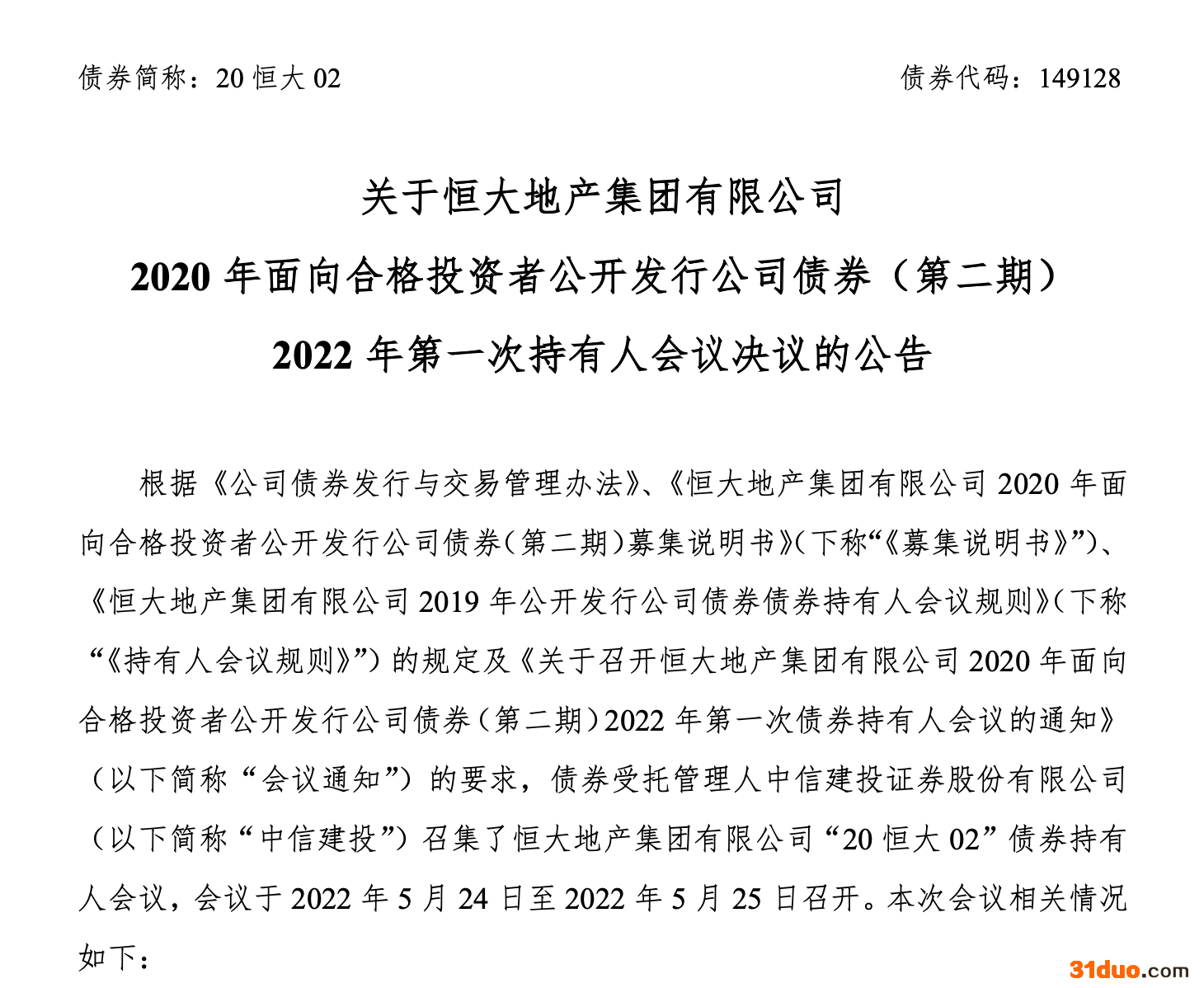 根据公告,“20恒大02”债券持有人会议于5月24日至25日召开。会议审议通过了《关于调整“20恒大02”债券本息兑付安排的议案》以及《关于要求发行人承诺“不逃废债”的议案》,以及《关于变更本期债券持有人会议相关时间的议案》。