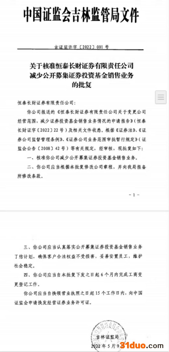 5月26日,证监会官网显示,恒泰长财证券减少证券投资基金销售业务的申请获得吉林证监局核准,公司应当自批复下发之日起6个月内完成工商变更登记工作;公司应当自换领营业执照之日起15个工作日内,向证监会申请换发经营证券业务许可证。