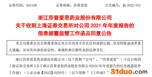 中国网财经5月27日讯(记者 顾凡)昨日,浙江莎普爱思药业股份有限公司(“莎普爱思”,603168.SH)发公告称,收到上交所对公司2021年年报信息披露监管工作函。