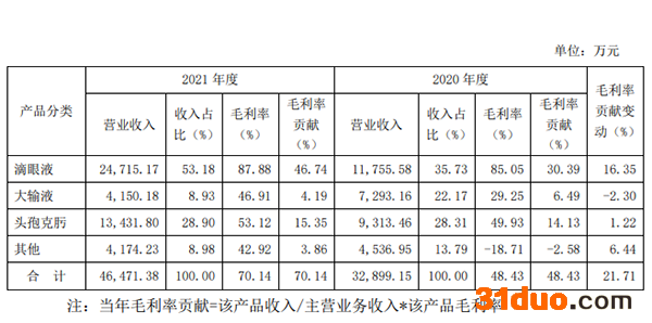 莎普爱思2021年年报披露,公司医药工业本期实现营收4.65亿元,同比增长41.25%,毛利率70.14%,同比增加21.71个百分点,主要系调整产品结构,低毛利大输液、中成药产品等占比下降所致。其中,大输液产品毛利率46.91%,同比增加17.66个百分点;头孢克肟产品收入1.34亿元,同比增长44.22%,毛利率53.12%,高出同行业同领域产品毛利率约14个百分点;其他产品毛利率42.92%,同比增加61.63个百分点。