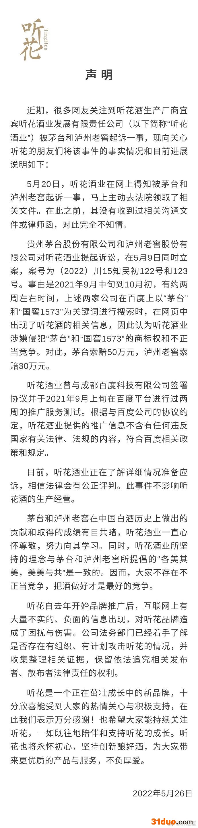文章提到,根据声明,贵州茅台股份有限公司和泸州老窖股份有限公司对听花酒业提起诉讼,在5月9日同时立案,案号为(2022)川15知民初122号和123号。事由是2021年9月中旬到10月初,有约两周左右时间,上述两家公司在百度上以“茅台”和“国窖1573”为关键词进行搜索时,在网页中出现了听花酒的相关信息,因此认为听花酒业涉嫌侵犯“茅台”和“国窖1573”的商标权和不正当竞争。对此,茅台索赔50万元,泸州老窖索赔30万元。