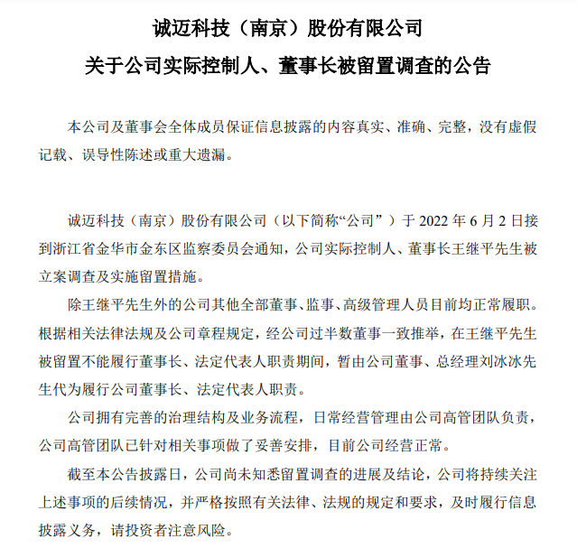 诚迈科技表示,公司日常经营管理由公司高管团队负责,公司高管团队已针对相关事项做了妥善安排,目前公司经营正常。截至本公告披露日(6月6日),公司尚未知悉留置调查的进展及结论,公司将持续关注上述事项的后续情况,并严格按照有关法律、法规的规定和要求,及时履行信息披露义务,请投资者注意风险。