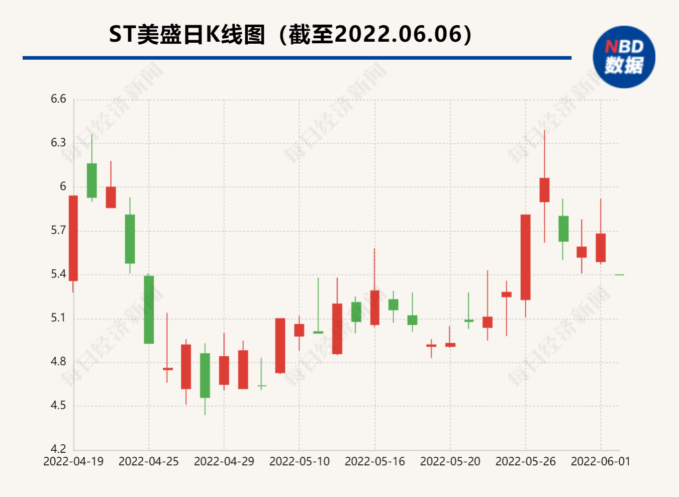6月6日,美盛文化股票复牌,并被实行其他风险警示,股票简称由“美盛文化”变为“ST美盛”(002699.SZ,收盘价:5.4元/股,市值:49亿元),公司股票日涨跌幅限制为5%。ST美盛股价当日即跌停,跌幅为4.93%。