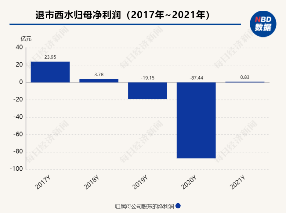 2021年报显示,退市西水全年营业收入1.06亿元,同比下降99.50%;归属于上市公司股东的净利润8261.78万元,上年同期为净亏损87.44亿元。