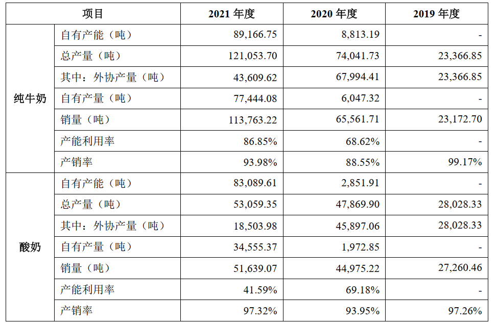 至于外界关心的“自主奶源”比例,也可以由招股书数据初步推算出来。招股书“主要原材料”一节显示,公司2019年至2021年外采生牛乳金额分别为1.09亿元、2.10亿元与4.11亿元,除以当年平均采购单价,外采数量分别为2.74万吨、5.22万吨与8.63万吨。而公司同期纯牛奶及酸奶的总产量之和分别为5.14万吨、12.19万吨与17.41万吨,推算同期外采奶源比例分别为53.34%、42.84%与49.57%,相应地,自主奶源比例分别为46.65%、57.16%与50.43%——也就是说,认养一头牛以“五好”标准精心喂养的荷斯坦奶牛与娟姗牛,所产的奶只有大概一半消费者能够享用得到。