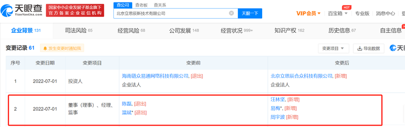 蓝鲸教育7月7日讯,近日豆神教育全资子公司北京立思辰新技术有限公司(简称立思辰新技术)发生工商变更。天眼查显示,7月1日,该公司董事(理事)、经理、监事一栏中,陈磊,温斌退出,汪林坚,易梅,周宇波加入。立思辰新技术的法定代表人由温斌变为易梅。