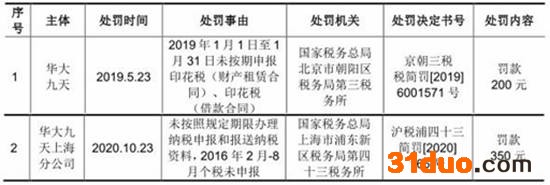 京朝三税税简罚[2019]6001571号显示,因华大九天2019年1月1日至1月31日未按期申报印花税(财产租赁合同)、印花税(借款合同),国家税务总局北京市朝阳区税务局第三税务所于2019年5月23日对其罚款200元。