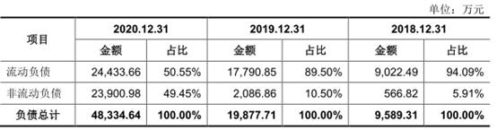 报告期内,公司负债总额分别为9589.31万元、1.99亿元、4.83亿元。