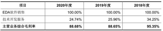 2018年至2020年,华大九天主营业务毛利率分别为95.35%、88.65%和88.68%。报告期内公司主营业务毛利率呈下降趋势,主要系主营业务收入结构存在变化以及技术开发服务业务毛利率自身存在一定下降所致。