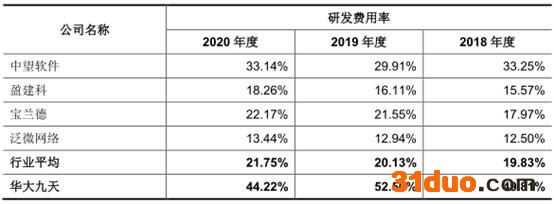 报告期内,公司研发费用率高于可比公司,可比公司研发费用率均值分别为19.83%、20.13%、21.75%。