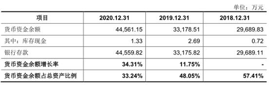 报告期内,公司无短期借款。公司货币资金余额分别为2.97亿元、3.32亿元、4.46亿元,占流动资产的比例分别为70.47%、65.53%、58.00%。
