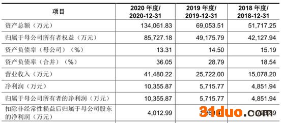 报告期内,公司实现归属于母公司所有者的净利润分别为4851.94万元、5715.77万元、1.04亿元,实现扣除非经常性损益后归属于母公司股东的净利润分别为1723.89万元、1269.41万元、4012.99万元。