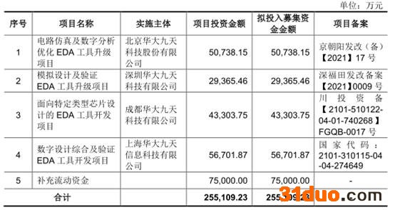 华大九天拟于深交所创业板上市,计划公开发行股票数量1.09亿股,占发行后公司总股本的比例为20%,拟募集资金25.51亿元,其中5.07亿元用于电路仿真及数字分析优化EDA工具升级项目、2.94亿元用于模拟设计及验证EDA工具升级项目、4.33亿元用于面向特定类型芯片设计的EDA工具开发项目、5.67亿元用于数字设计综合及验证EDA工具开发项目、7.50亿元用于补充流动资金。