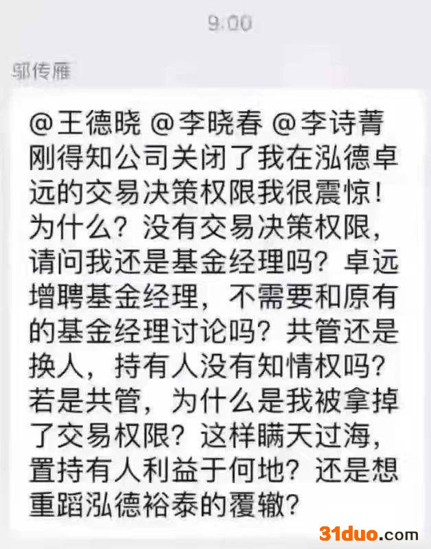 8月30日晚,一张邬传雁责问管理层的微信截图在网络上广为流传。邬传雁表示,公司关闭了自己在泓德卓远的交易决策权限。