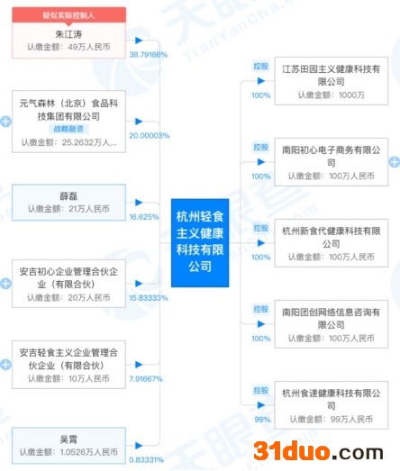天眼查数据显示,田园主义背后的杭州轻食主义曾于去年12月获得元气森林的天使投资,元气森林目前持股20%。