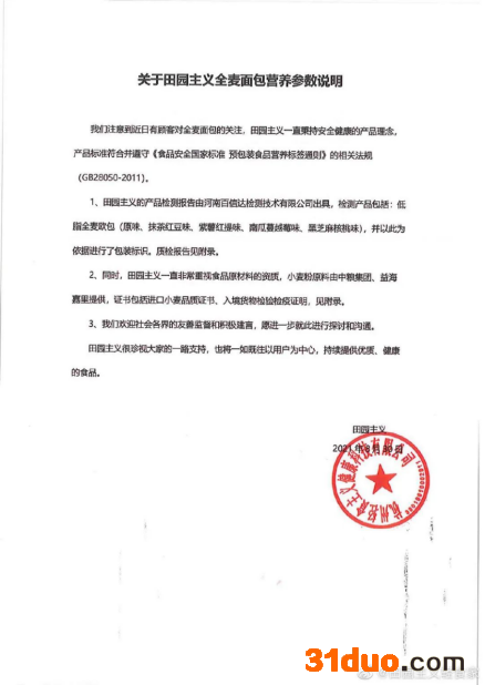 说明表示,田园主义一直秉持安全健康的产品理念,产品标准符合并遵守国家相关法规。
