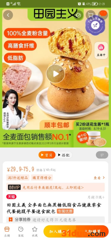 官网称,田园主义产品也受到了众多网红媒体和大V的支持和推荐,仅一款健康全麦欧包的淘宝月销售额就超过8万,切片吐司月销均超过5万笔,全麦薄脆饼干与鸡胸肉丸等产品的月销也过万。即便是直接搜索“全麦面包”品类,田园主义的销量,也可以称得上是淘宝数一数二的主打烘焙的轻食品牌。