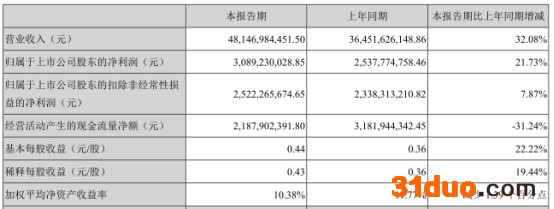 立讯精密8月24日晚发布的2021年半年度报告显示,今年上半年,公司实现营业收入481.47亿元,同比增长32.08%;实现归属于上市公司股东的净利润30.89亿元,同比增长21.73%;实现归属于上市公司股东的扣除非经常性损益的净利润25.22亿元,同比增长7.87%;实现经营活动产生的现金流量净额21.88亿元,同比减少31.24%。