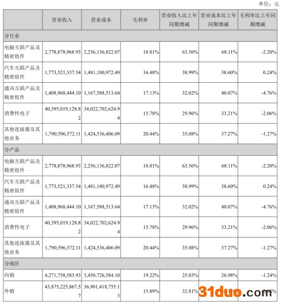 分行业/分产品来看,电脑互联产品及精密组件毛利率18.81%,同比减少2.20%;汽车互联产品及精密组件毛利率16.48%,同比增长0.24%;通讯互联产品及精密组件毛利率17.13%,同比减少4.76%;消费性电子毛利率15.78%,同比减少2.06%;其他连接器及其他业务20.44%,同比减少1.27%。