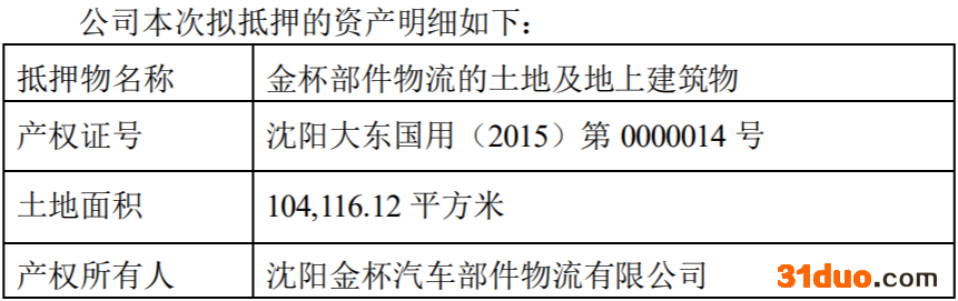 据乐居财经了解,金杯汽车经营发展及融资需求,拟以全资子公司沈阳金杯汽车部件物流有限公司持有的土地及地上建筑物作为抵押物向华夏银行股份有限公司沈阳铁西支行申请贷款,公司此次贷款额度已于第九届董事会第二十次会议、2020年年度股东大会审议通过。