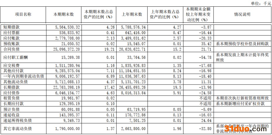 报告期内,新湖中宝有息负债合计450.32亿元,占总资产的34.47%,较期初减少89.65亿元。有息负债中,短期借款和一年内到期的有息负债合计144.13亿元,占比32.01%,一年以上有息负债306.19亿元,占比67.99%;按融资机构分:银行借款64.77%,公司债占比23.24%,其他类型借款占比12%。