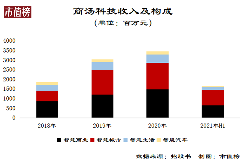 从2021年上半年的数据看,智慧商业和智慧城市是商汤的两大业务支柱,合计占收入的比重近90%。