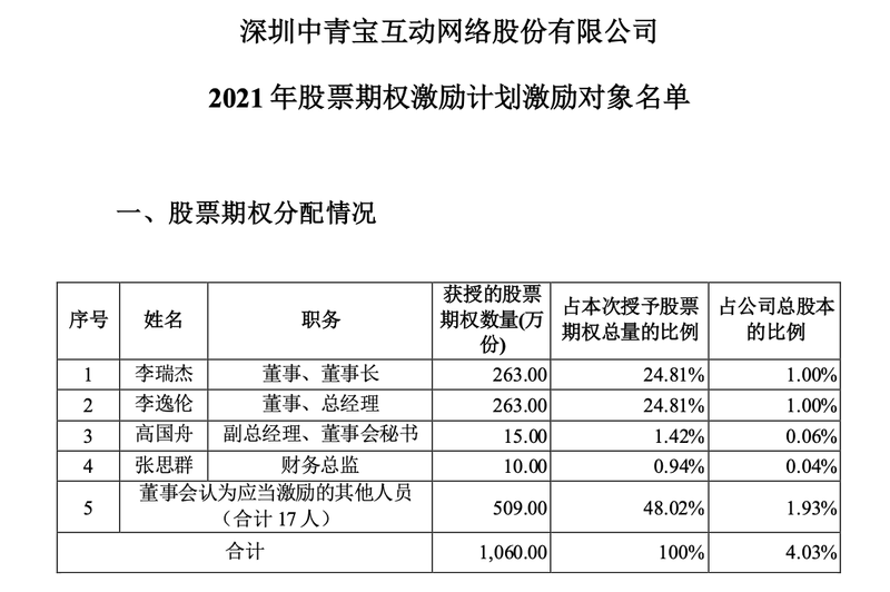 《草案》显示,中青宝拟向不超过21名激励对象授予股票期权1060万份,约占公司股本总额的4.03%。其中,公司董事、董事长李瑞杰,以及公司董事、总经理李逸伦将分别获授股票期权数量为263万份,占本次总量的24.81%,占公司总股本比例为1%。而董事会认为应当激励的其他人员共17人,共将获授股票期权数量为509万份,占本次总量的48.02%,占公司总股本比例为1.93%。