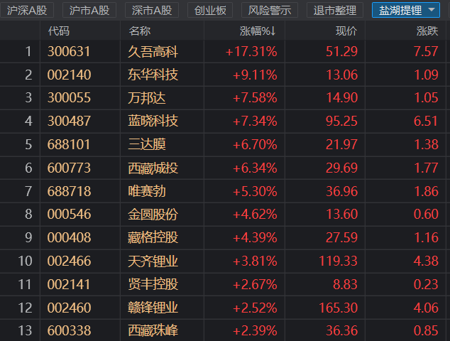 财联社(上海,编辑 梓隆)讯,今日(11月26日),盐湖提锂板块大幅走强,一度领涨两市,截止午间收盘,板块指数大涨逾4%,个股方面,久吾高科涨逾17%,东华科技涨逾9%,万邦达、蓝晓科技涨逾7%,三达膜、西藏城投、唯赛勃、金圆股份、藏格控股涨幅居前。