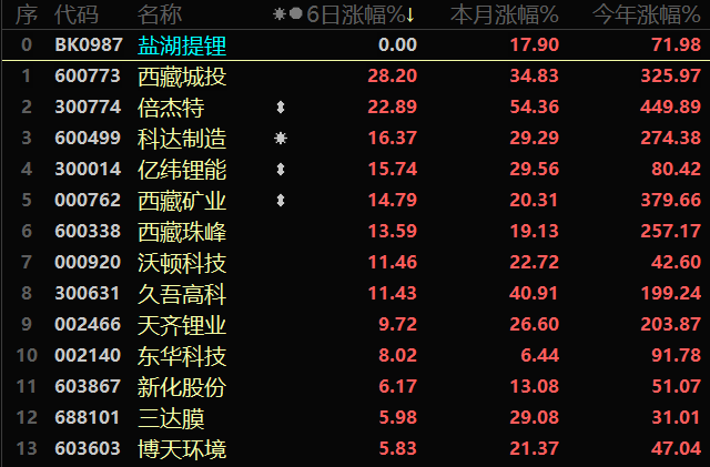 近期,锂资源板块大幅走强,盐湖提锂板块近8日板块指数上涨近18%,板块走强也带动相关个股集体起飞,以近6日涨跌幅来统计,截止今日(11月26日)午间收盘,西藏城投、倍杰特涨幅逾20%,科达制造、亿纬锂能、西藏矿业、西藏珠峰、沃顿科技、久吾高科涨幅逾10%。