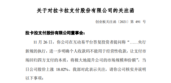 11月29日早间,上市公司拉卡拉(300773.SZ)收到来自深交所的关注函,主要针对26日其股价异动,并于互动平台公开表示央行新规利好公司发展等。深交所要求拉卡拉说明,回复内容是否谨慎、客观;是否在炒作股价,以及是否存在违反信息披露相关规定的情形。