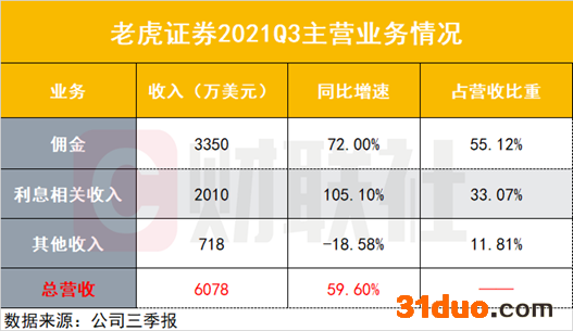 国际化战略助推下,三季度老虎证券核心经纪业务实现稳健增长,期内佣金收入为3350万美元,同比增长72.0%;利息相关收入为2010万美元,同比增长105.1%。