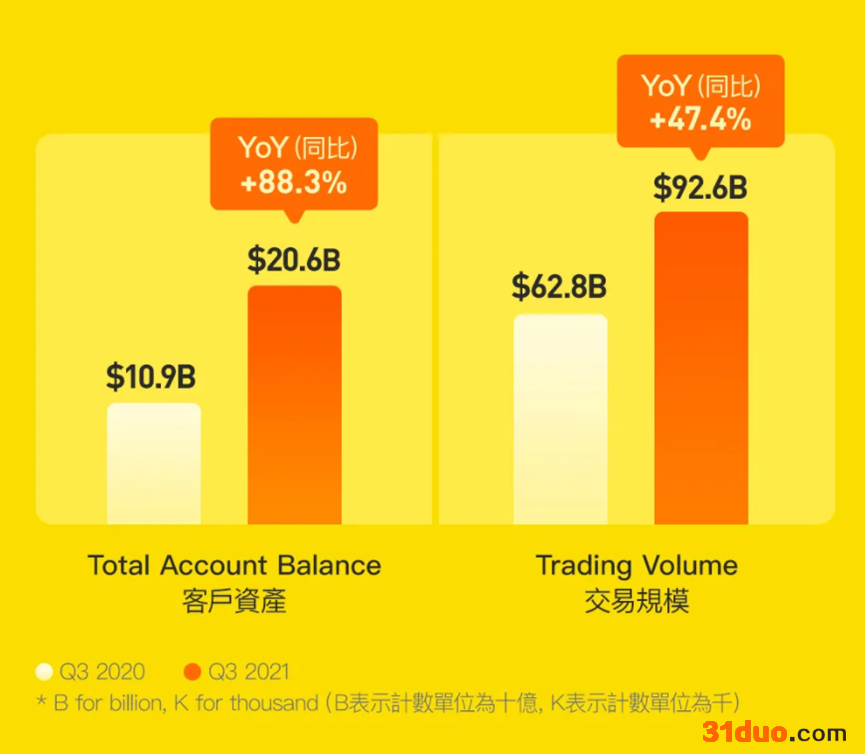 与此同时,公司Q3全球开户人数达176.7万,全球入金客户达61.2万,已提前完成2021年度入金指引。交易规模同比增长47.4%至926亿美元;客户资产为206亿美元,同比增长88.3%。