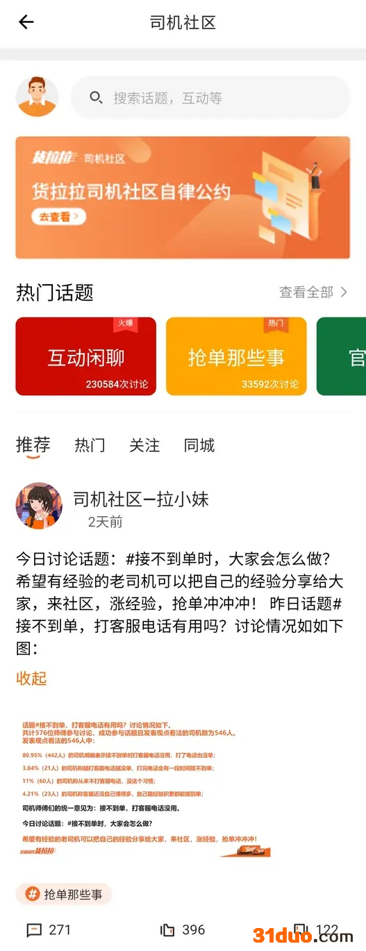 货拉拉APP司机版的司机社区页面显示,其设置了互助闲聊、聚焦恳谈会、官方活动等几个内容板块,进入司机社区的司机们可以在司机社区里面关注自己感兴趣的内容,也可以看到推荐、热门以及各地司机发布的帖子内容。