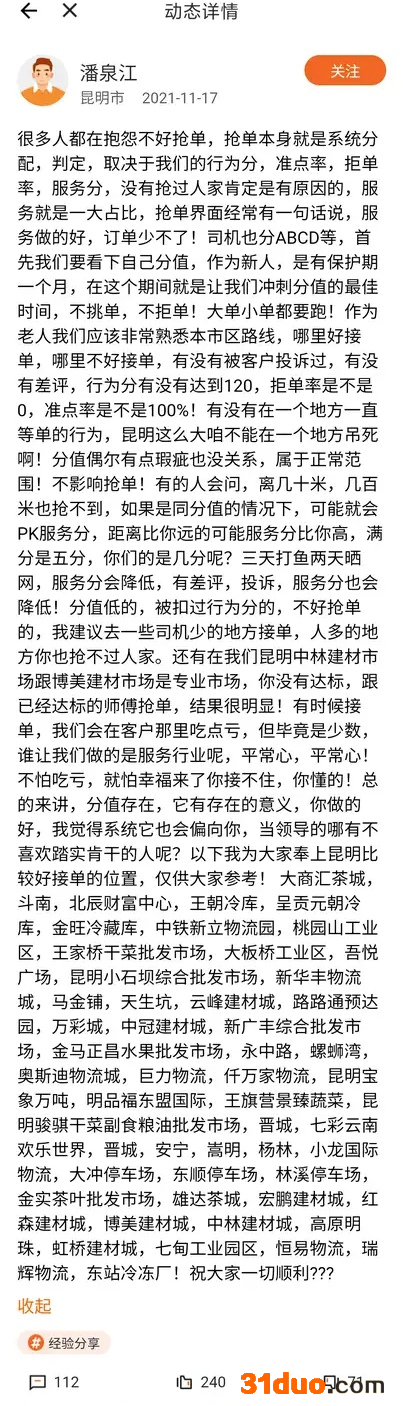 潘师傅还将自己认为昆明市内比较好接单的位置整理发布出来供司机们参考:“大商汇茶城、斗南、北辰财富中心、王朝冷库、中铁新立物流园、桃园山工业区......”该贴很快便引来司机们的关注,点赞数达到240个,评论数也达到112条。