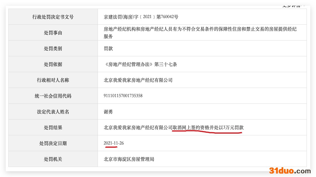 中华网财经查询获悉,北京市海淀区房屋管理局发布的行政处罚决定书文号“京建法罚(海房)字﹝2021﹞第760042号”显示,北京我爱我家房地产经纪有限公司因“房地产经纪机构和房地产经纪人员有为不符合交易条件的保障性住房和禁止交易的房屋提供经纪服务”被北京市海淀区房屋管理局取消网上签约资格并处以3万元罚款。处罚决定日期为2021年11月26日。