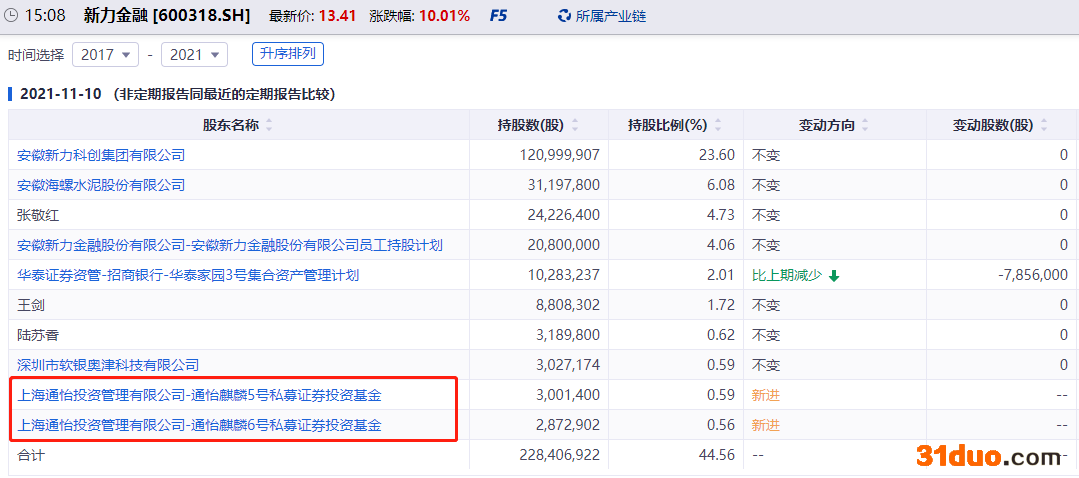 wind数据显示,截至2021年11月10日,上海通怡投资旗下的两只私募产品新进成为新力金融的前十大股东,其中“通怡麒麟5号私募基金”持有300.14万股,“通怡麒麟6号私募基金”持有287.2902万股,分别为第九和第十大股东。