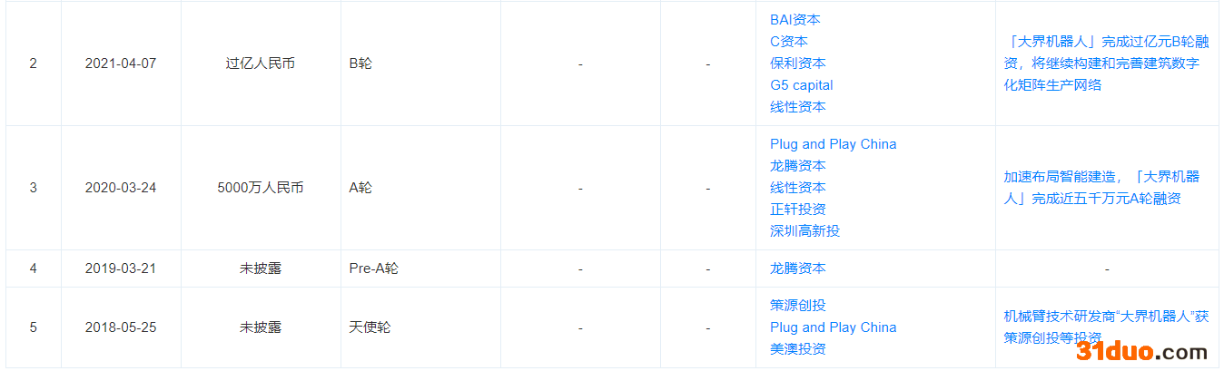 据天眼查显示,2018年5月至2021年4月,大界机器人已完成天使轮、Pre-A轮、A轮、B轮共四轮融资。