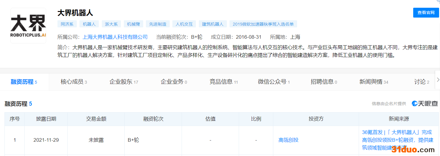 中国经济网北京11月30日讯 中国经济网记者近日在天眼查发现,上海大界机器人科技有限公司(以下简称大界机器人)日前获得了B+轮融资,本轮融资由高瓴创投独家领投。