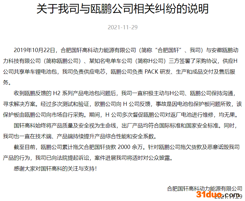 11月29日,国轩高科官网发布说明,其中提到事故是因电池包保护板问题所致。并表示,截至目前,瓯鹏公司累计拖欠合肥国轩货款2000余万元。针对瓯鹏公司拖欠货款及恶意诋毁公司产品的行为,公司已向法院提起诉讼,案件进展将适时对公众披露。